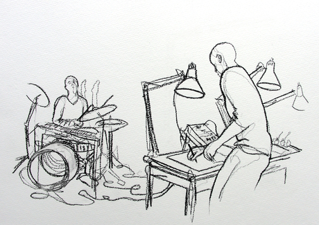 Jean-Baptiste Maillet und Romain Bermond komponieren hier als zeichnende Geräuschemacher, filmvorführende Orchestermusiker oder auch erzählende Requisiteure ein vierhändiges Stück. Während der eine mit ein paar Pinsel- oder Bleistiftstrichen das Bühnenbild entstehen lässt, erschafft der andere ein musikalisches Klanguniversum voller Überraschungen. Es lässt sich gar nicht genau sagen, ob nun die Hände des Polyinstrumentalisten die zeichnende Hand begleiten oder umgekehrt, so sehr sind die beiden Elemente miteinander verwoben. Ton und Bilder kreuzen sich, vermischen sich, antworten einander.