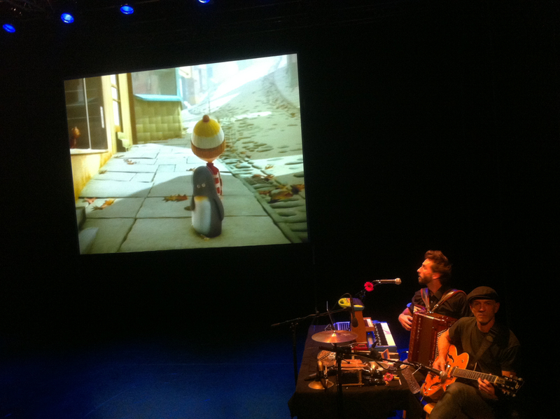 Auf der Bühne: zwei Animationsfilme auf großer Leinwand und zwei vielseitige Musiker an einem Tisch. Pierre Payan und Nicolas Méheust untermalen die Bilder, die wir sehen, musikalisch. Vor unseren Augen schaffen sie originelle Partituren mit den verschiedensten Instrumenten wie Gitarre, Mini-Klavier, Entenlockpfeife, Akkordeon, Xylophon, Pfeifen und sogar eine Nintendo DS. Ihre Musik hält viele Überraschungen bereit und begleitet die Abenteuer eines Drachens, der aus Versehen unter Enten auf die Welt kommt und einen Pinguin, der bei einem kleinem Jungen auftaucht.